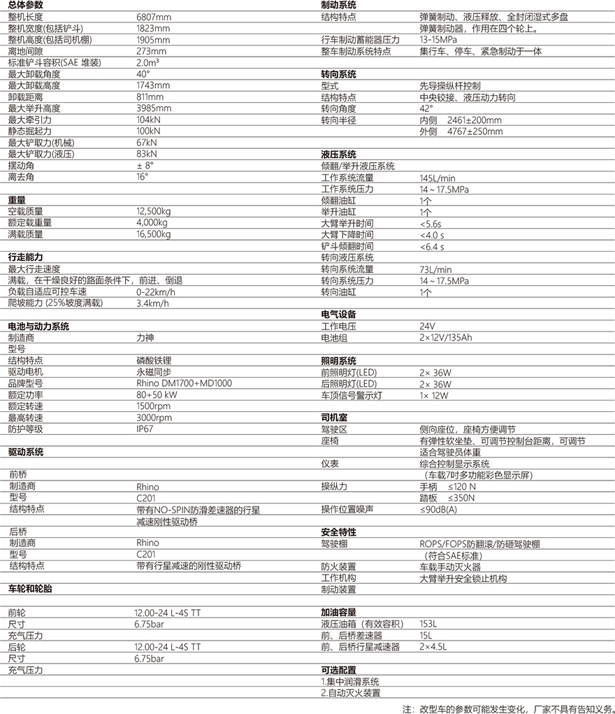 产品采用高质量同步永磁电机直接驱动车桥,传动系统简单高效,没有了柴油机和变速箱的动力系统可靠性显著提高。液压油泵采用了负载启动控制技术,减少液压系统的无用功消耗,同时提高液压系统寿命和可靠性。整机运行保养维护简单,能耗和备件运行成本大大降低。